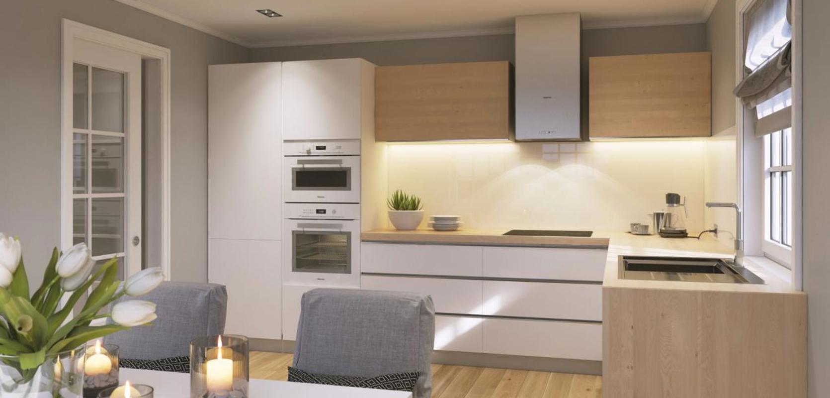 Velger du Mesterhus Kine med allromsløsning, får du god plass til en egen frokostkrok og et langbord for familie og venner. Du kan også legge til en peis, for de som drømmer om det.
