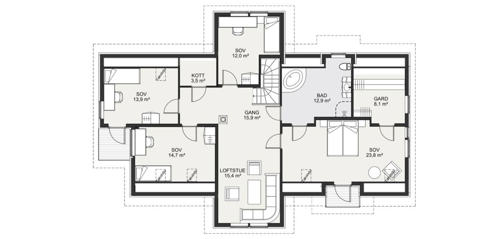 Her har du fire soverom, et gjesterom, stort kjøkken og en vinkelstue, to bad og eget vaskerom, samt en romslig loftstue. Du kan til og med velge å ha flere peiser i huset hvis du ønsker det.