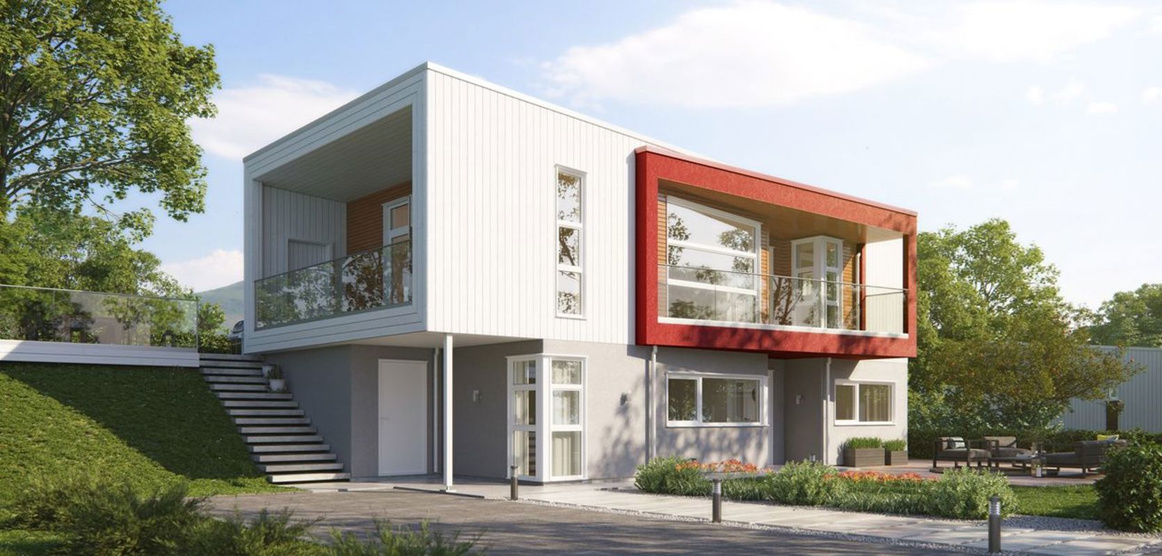 Signatur 308 er spesielt tilpasset en skrå tomt, og hovedinngangen er plassert i underetasjen. Under balkongen på hovedplanet finner du en romslig hall med inngang til en tv-stue, et stort bad med tilgang til eget vaskerom og to praktiske soverom. Det tredje soverommet ligger innenfor tv-stuen. På utsiden er det også en egen sportsbod, perfekt for oppbevaring av sportsutstyr eller hagemøbler.
