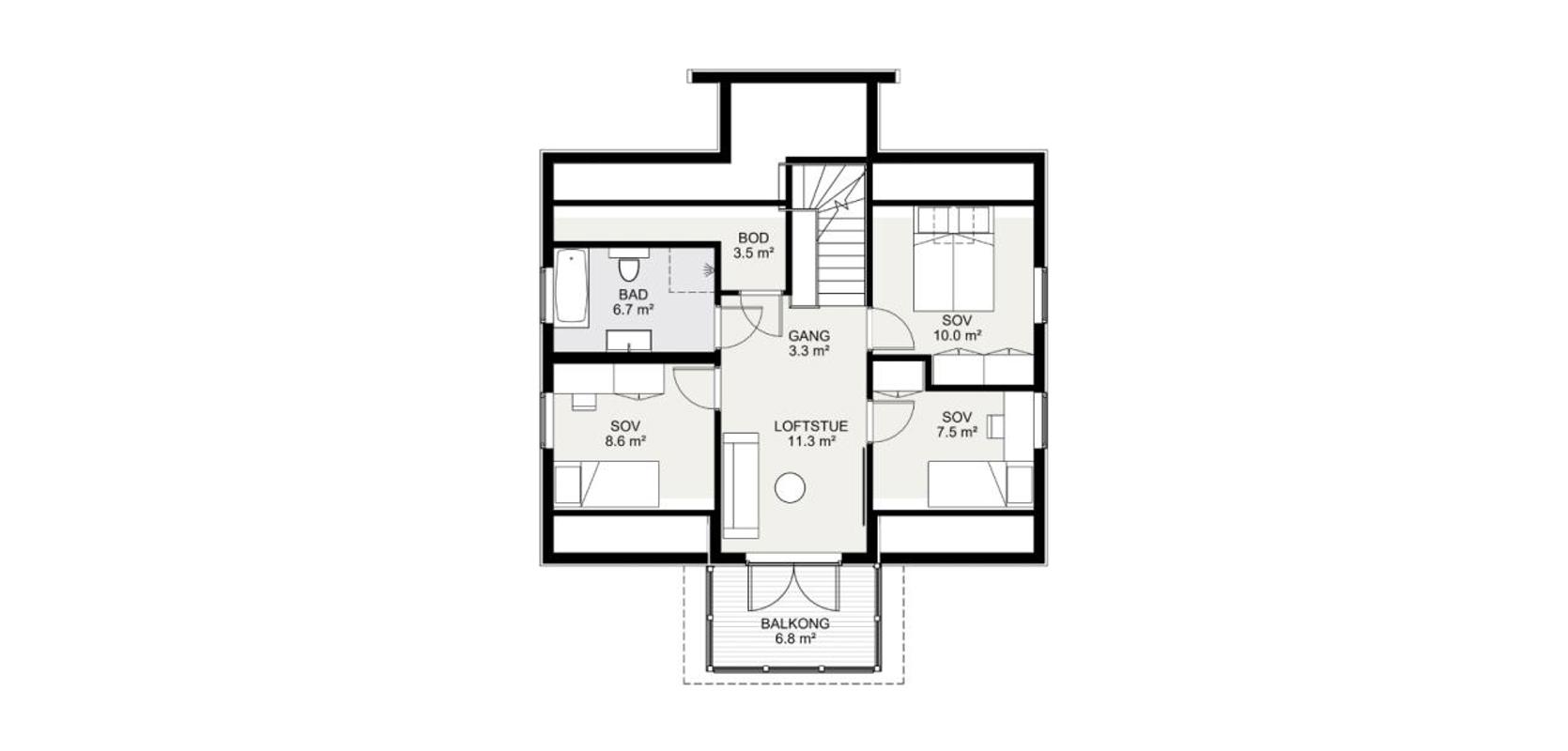 I andre etasje finner du tre soverom, bad, bod og en koselig loftstue med utgang til balkong. Huset kan leveres med kjeller, og deler av stuen kan også gjøres om til et soverom i første etasje.