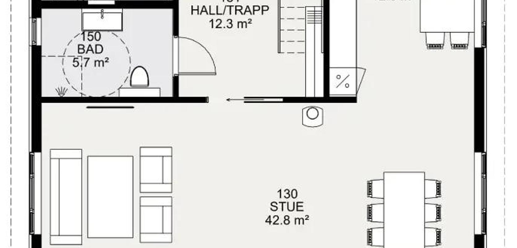 Kjøkkenet ligger i en krok med et stort vindu, noe som gir en intim og koselig, men samtidig lys opplevelse av rommet. Det er også plass til flere sittegrupper i oppholdsrommet, og du vil nyte et fint og lyst område under arken som stikker ut midt på huset. Herfra er det også en dobbeltdør ut mot terrassen og hagen.